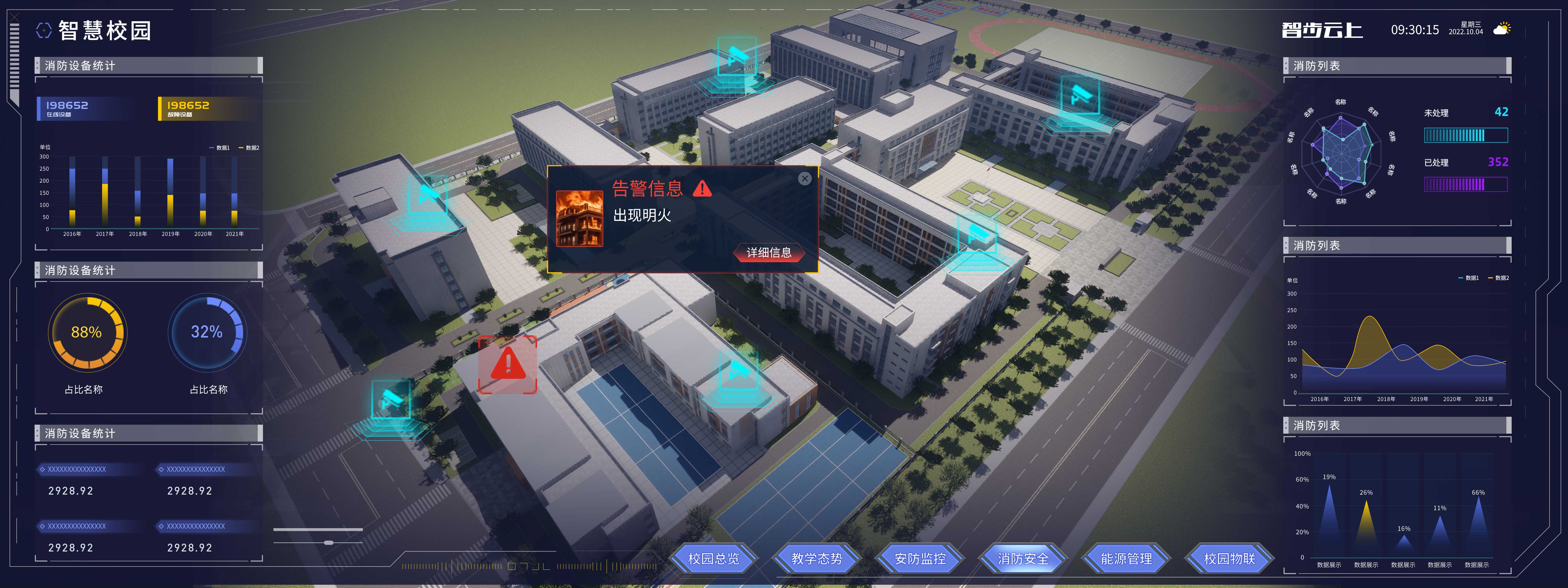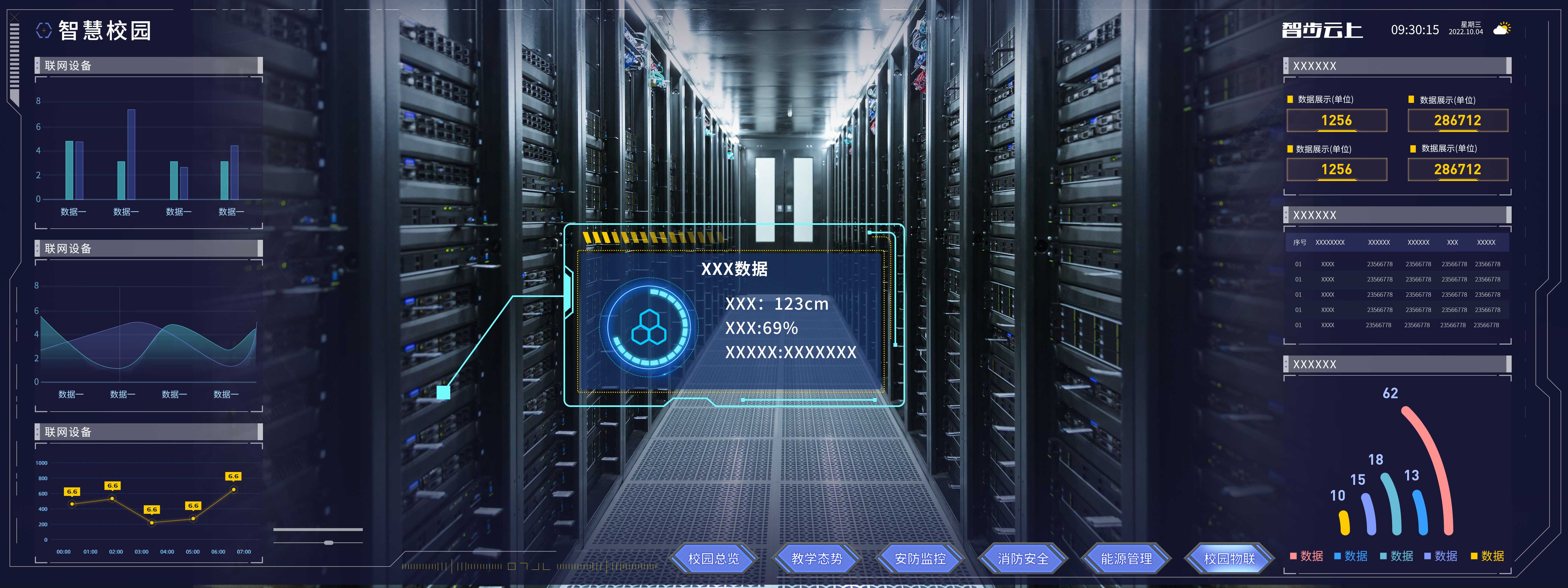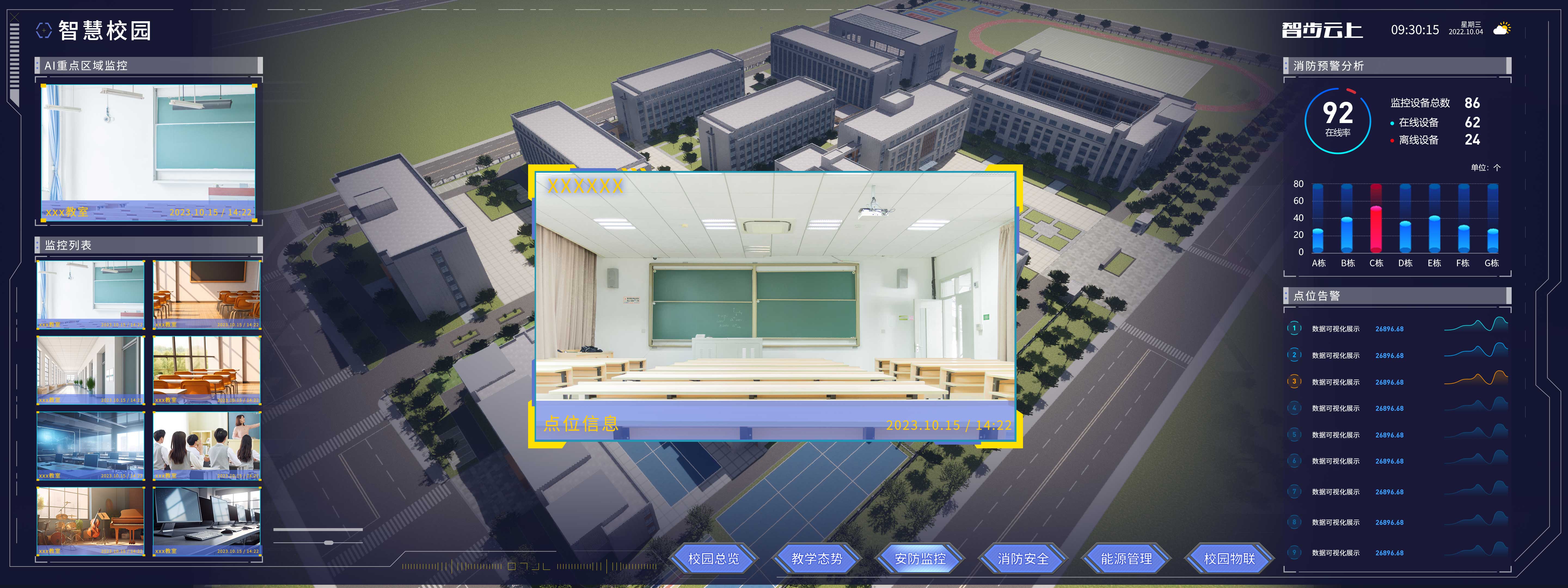 對接智慧校園3D可視化平臺,將系統數據庫數據同步至前端可視化平臺,以動態數據圖表和動態的三維效果將系統監控數據進行數據呈現。